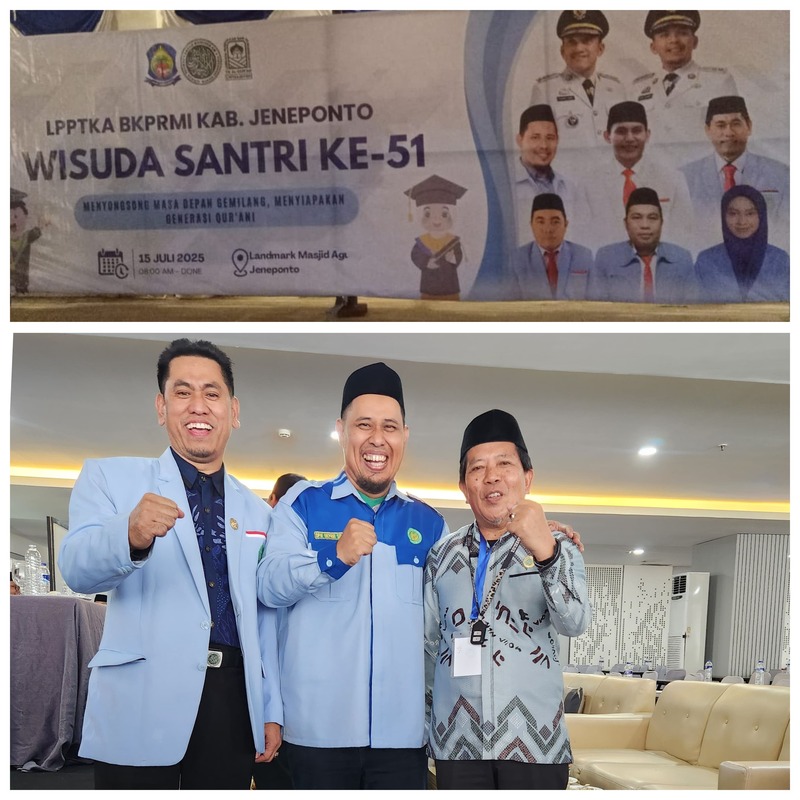 Jeneponto, mediaukhuwah.id – 14 Juli 2025. Hanya dua hari pasca terpilih sebagai Ketua Umum DPW BKPRMI Provinsi Sulawesi Selatan, Asri Said langsung melakukan debut perdana dalam kunjungan resmi ke Kabupaten Jeneponto didampingi beberapa Ketua Umum DPD BKPRMI se Sulawesi Selatan diantaranya Ketum DPD BKPRMI Maros, Makassar, Gowa, Takalar, Bantaeng dan Selayar. Dalam kunjungan bersejarah ini, ia akan membawakan sambutan sekaligus mewisuda sebanyak 1.032 santri TKA/TPA di bawah naungan LPPTKA DPD BKPRMI Kabupaten Jeneponto.